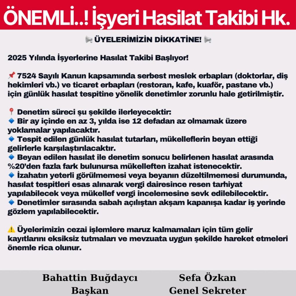 📌 7524 Sayılı Kanun kapsamında serbest meslek erbapları (doktorlar, diş hekimleri vb.) ve ticaret erbapları (restoran, kafe, kuaför, pastane vb.) için günlük hasılat tespitine yönelik denetimler zorunlu hale getirilmiştir.
