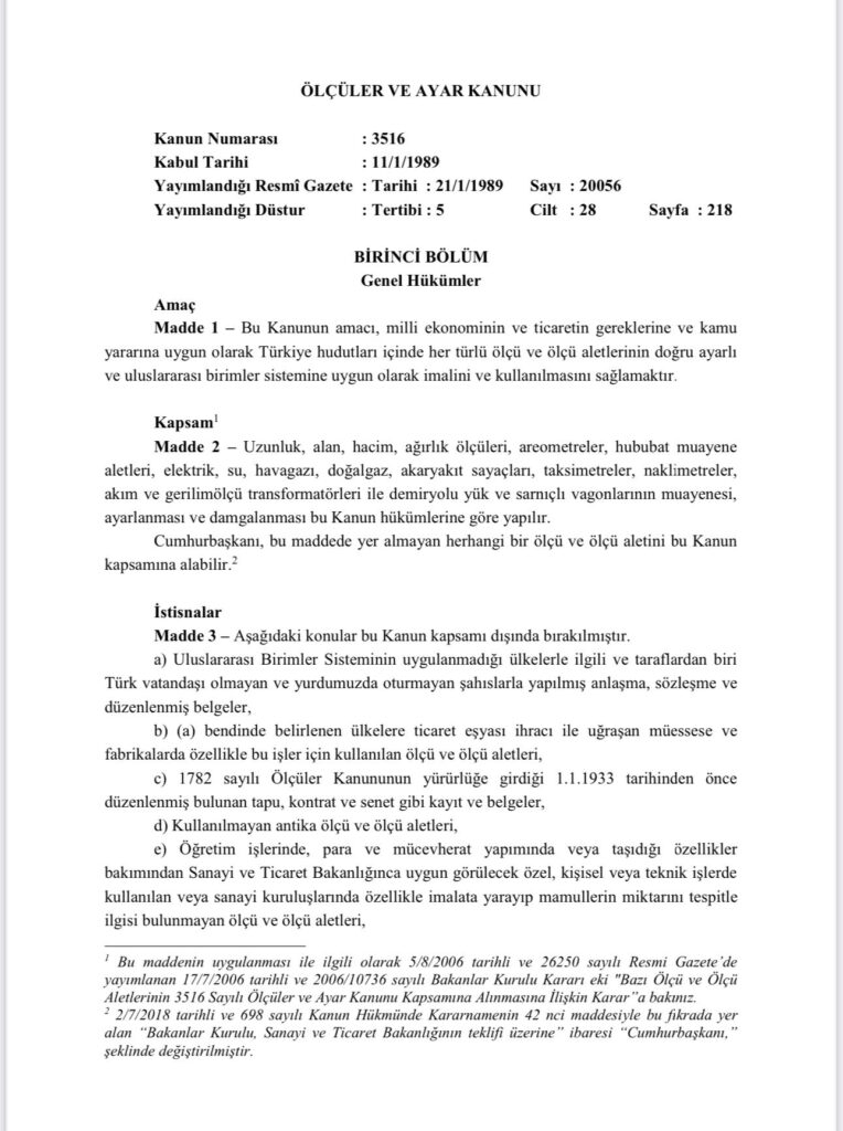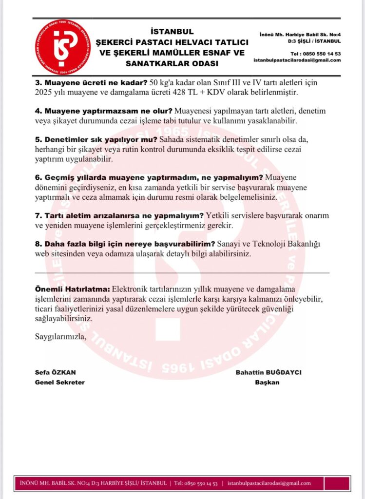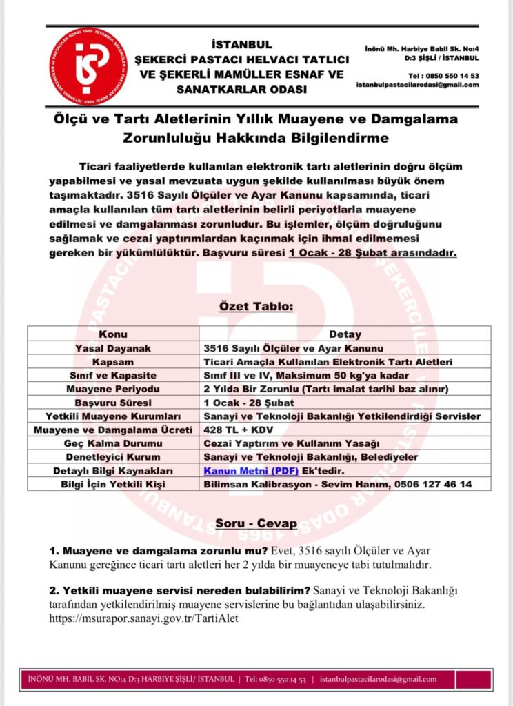 3516 Sayılı Ölçüler ve Ayar Kanunu gereğince, ticari amaçla kullanılan tüm tartı aletlerinin 2 yılda bir muayene edilmesi ve damgalanması zorunludur. Bu işlemi yaptırmayan esnaflarımız cezai yaptırımla karşılaşabilir ve tartı aletlerinin kullanımı yasaklanabilir.