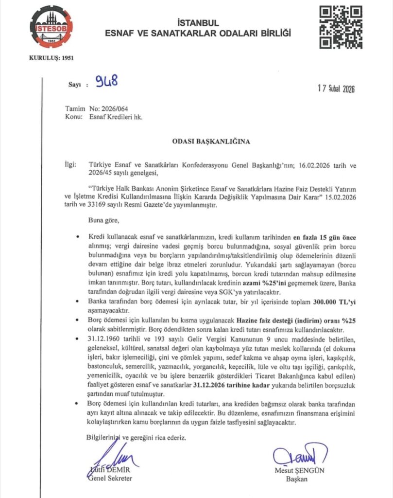 15.02.2026 tarihli Resmî Gazete’de yayımlanan düzenleme ile esnaf ve sanatkârlarımızın kredi kullanım süreçlerinde önemli değişiklikler yapılmıştır.