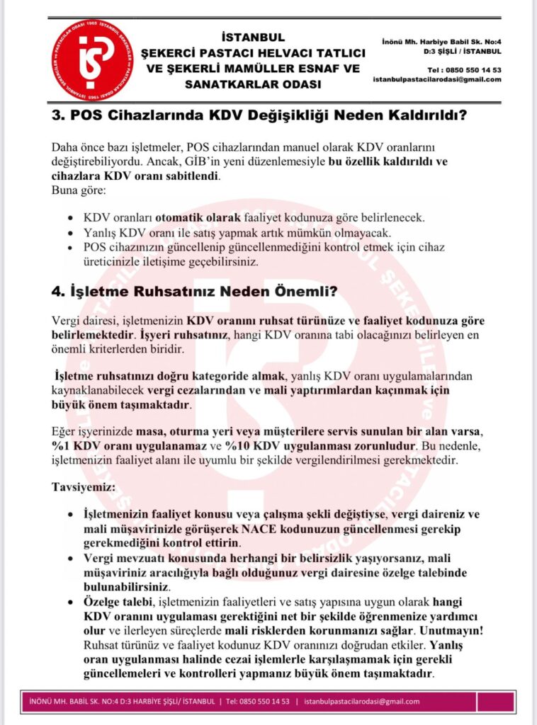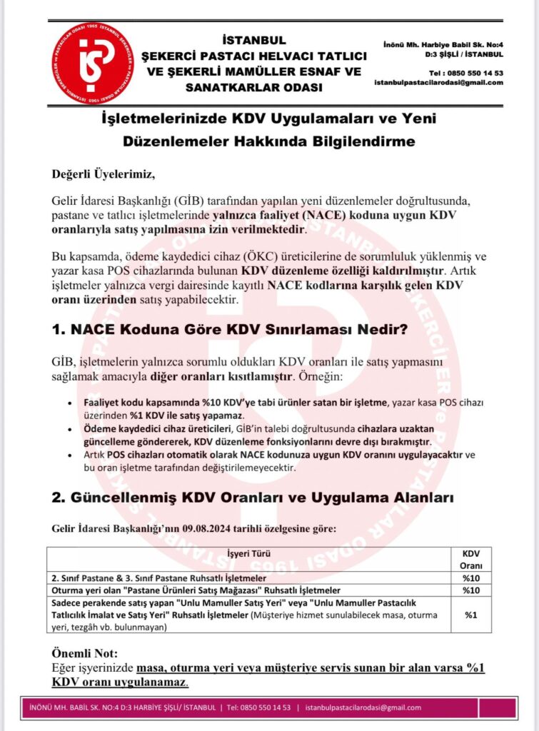 Gelir İdaresi Başkanlığı’nın (GİB) yeni düzenlemesi ile pastane ve tatlıcı işletmelerimiz için KDV uygulamalarında önemli değişiklikler yapılmıştır. Bu değişiklikler doğrultusunda, işletmeler yalnızca faaliyet (NACE) koduna uygun KDV oranlarıyla satış yapabilecek ve POS cihazlarında KDV oranı değiştirme özelliği kaldırılmıştır.