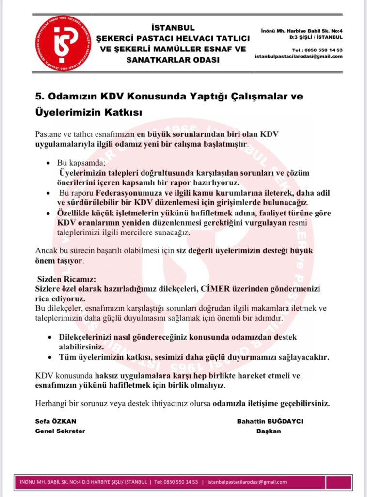 🔹 Küçük işletmelerin yükünü hafifletmek ve adil bir KDV düzenlemesi sağlamak için resmî makamlara taleplerimizi sunacağız.